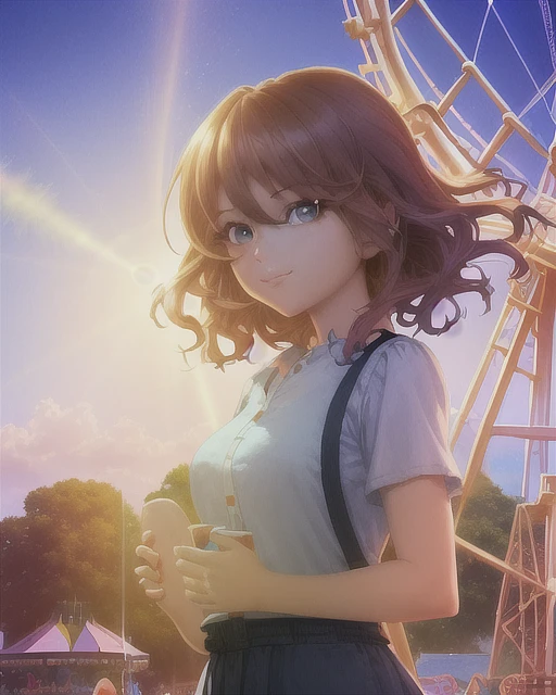 1girl, painting of a girl at an amusement park, on a ride high in the sky, can see other parts of the park, scared but excited, morning, sun is shining, no fog or clouds, natural hair color and eyes, anime, anime face, art by artgerm and greg rutkowski and alphonse mucha, 8k, professionally color graded, depth of field