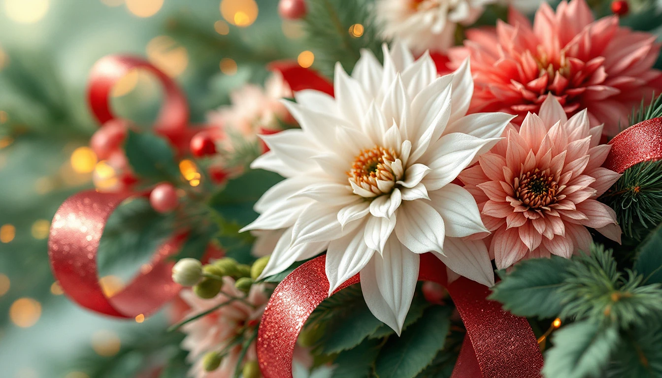 Imagine a minimalist abstract, with 3D metallic tones for Christmas, featuring a bouquet in white, green, and bright red candy cane colors. This display includes hybrid flowers with long, slim, curly petals, accompanied by mums and poinsettias. Pine sprigs, highlighted by large, curly, glittering ribbons of random colors, complete the arrangement, all against a glowing festive background with a macro close-up of the flowers, fostering an abstract sense of peace and calm.