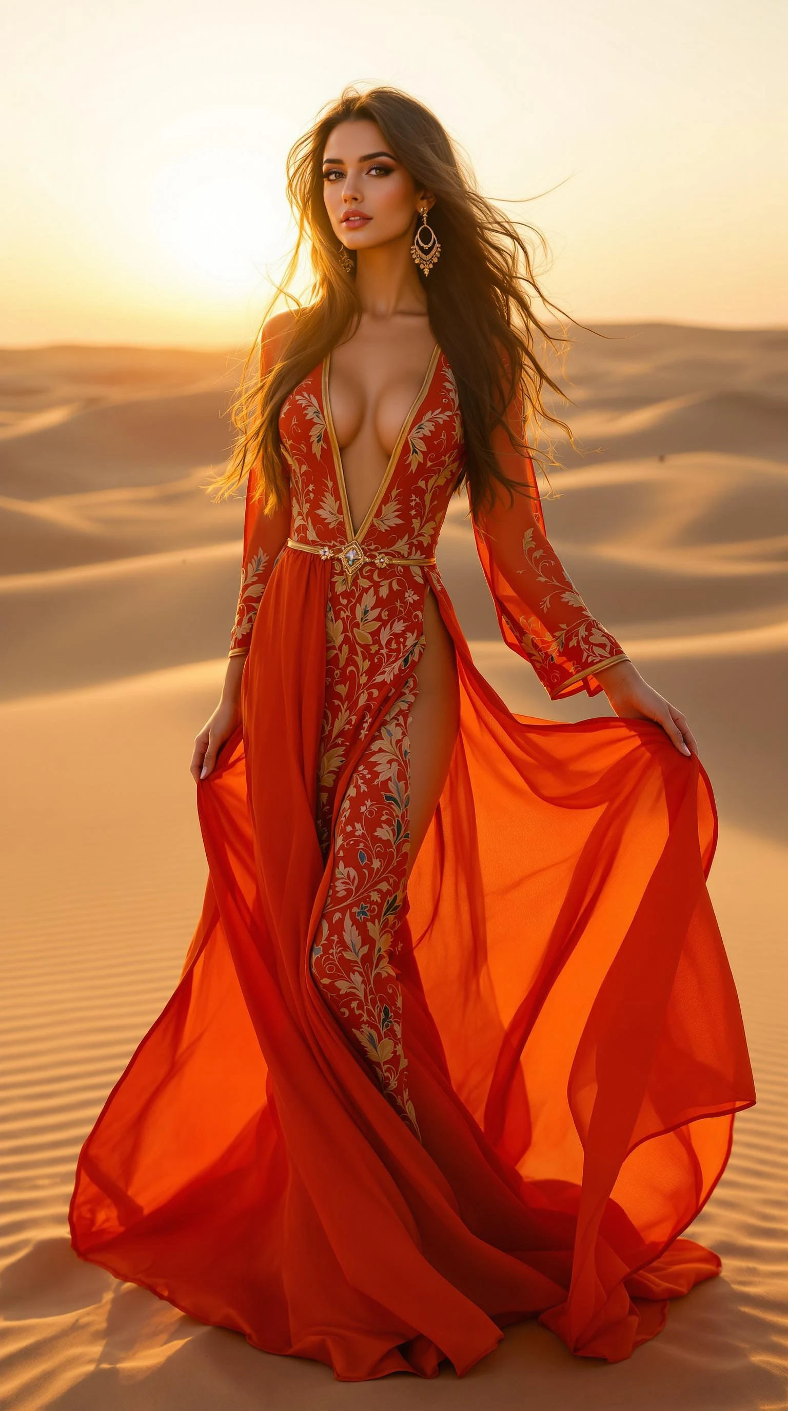 ### **1. Wüstenlandschaft mit einer Arabischen Schönheit** Eine arabische Frau mit langen, welligen Haaren trägt ein eng anliegendes Kleid in leuchtenden Canna-Farben (Rot, Gelb, Orange) . Sie posiert vor den majestätischen Sanddünen der Dubai-Wüste bei Sonnenuntergang, während ihr Kleid im Wind weht.