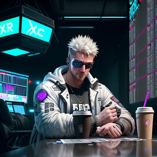 Hyper realistic eye level exterior photo of The Trading room is digital art dim, with only the white light from the screens illuminating the room. The alpha dog Trader is sitting in front of a wall of large trading screens, typing code on a keyboard. He wears cyberpunk crypto coin implants and drinks extra large coffee. He loves coffee. The programmer is surrounded by chaos, hyper realism, high detail, octane render, celestial arena,  fire storm,  ice storm,  body crackling with lightning,  lightning halo,  tilted halo,  crackling lightning,  lightning charged atmosphere,  beautifully detailed fur,  brilliant detailed eyes,  beautifully detailed face, but he doesn't seem to notice or care. Digital Art. 3D Render 8k