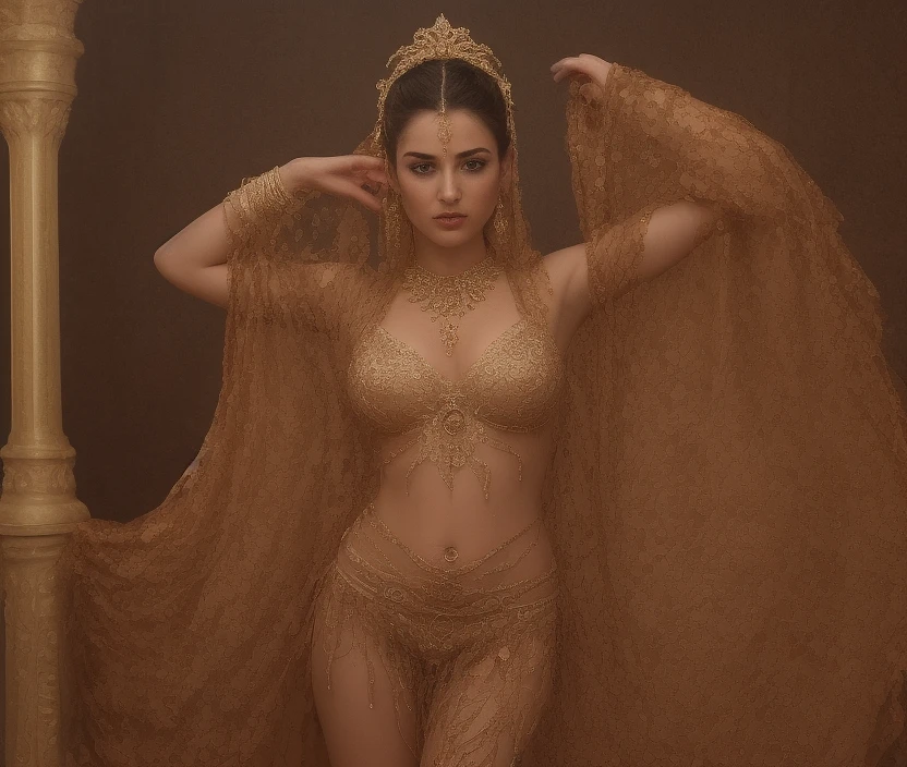 *Description* A breathtakingly detailed, hyper-realistic depiction of a gorgeous Spanish woman from behind in a stunning crimson belly dancing outfit, adorned with intricate gold jewelry that accentuate her beauty, her stomach is taut and chiseled, standing tantalizingly outside a desert dance pit with ornate pillars. *Character Details* - Exquisite, photorealistic face with precise cosmetic features -Stunning, detailed eyes sparkling with vitality - Full, luscious lips - Flawless, radiant skin. - lithe, taut chiseled stomach, large DD chest. - hip length, luscious dark raven hair cascades beautifully around her. - wears a matching red skirt and bra, exuding an air of exotic elegance, both are adorned with gold accents, golden embroidery and green gemstones. - The skirt is split at the front, revealing her leg, is adorned with gold accents, gold embroidery, and green gemstones. *Attire and Accessories* - Gold jewelry, gold attire chains, wrist cuffs, upper arm coifs, belly button adornment, thigh bands, ankle cuffs, and a gold band encircling her neck add a touch of luxury, elegance, beauty and mystery. - Intricate embroidery and patterns decorate the outfit along with green gemstones *Environment* - wide angle shot. -sunlight creates an enchanting ambiance. - Outside a medieval desert dance pit with ornate pillars, swirling clouds overhead. - Dramatic, cinematic lighting with soft, golden hues - Wide-angle perspective, emphasizing grandeur *Overall Mood* - The woman's pose and attire evoke a sense of mystery and allure. - Her confident stance suggests she is about to perform a mesmerizing dance. *Rendering Details* -wide angle - 8K resolution with sharp focus - Hyper-realistic rendering with extreme details - Photorealistic textures and shading - Cinematic, high-contrast lighting
