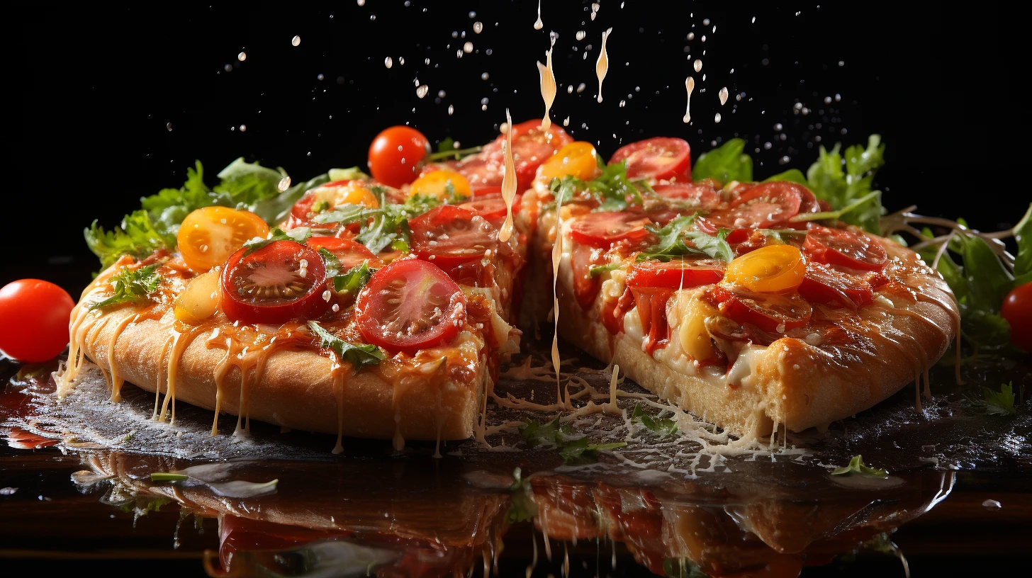 large pizza with many toppings, in the style of luminosity of water, lively movement portrayal, dark reflections, poured, water drops, low resolution, joyful celebration of nature --ar 128:71