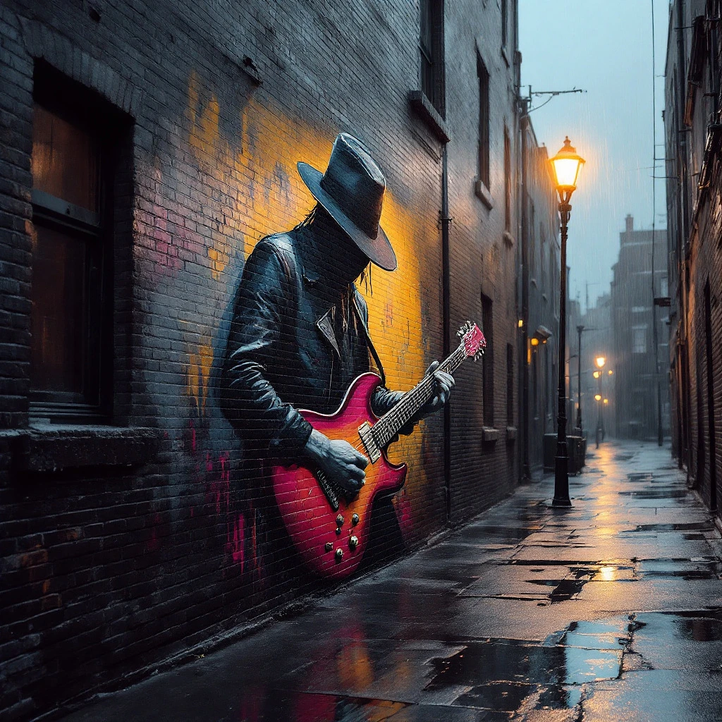Street graffiti spray paint mural of a cool alternative guitar player with a hat low over his eyes. Super hip, cool, and fanciful. Dark, film noir, 1990s styles. Painted on a large brick wall in a dim alleyway barely lighted by a lone streetlight. It's raining lightly. --chaos 50 --ar 1:2 --stylize 750