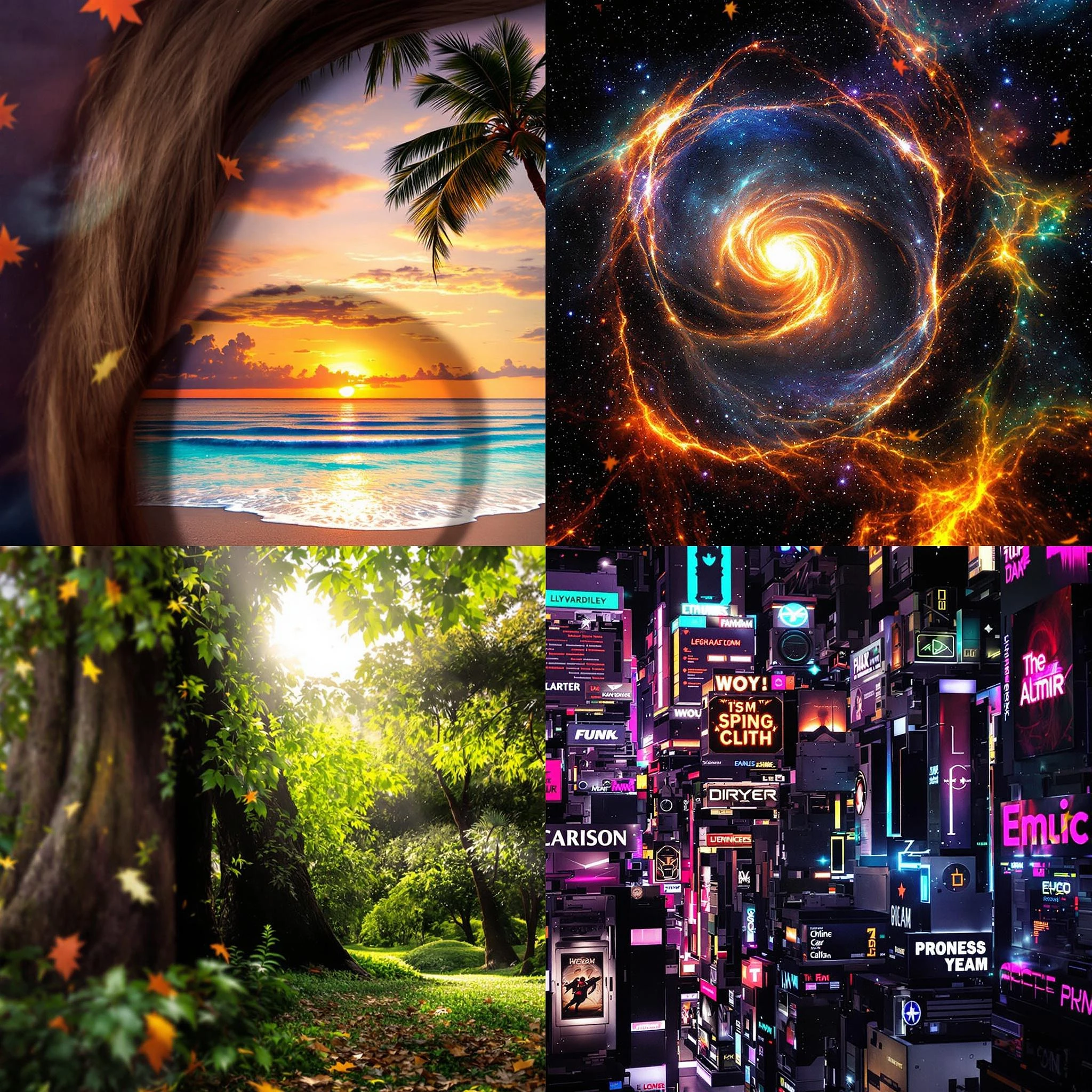 "Face portrait collage of four different scenes. The top left shows a serene beach sunset with palm trees and clouds. The top right features a cosmic scene with a bright, swirling nebula. The bottom left depicts a lush green woodland with falling leaves. The bottom right shows a busy cyberpunk city with illuminated streets and buildings. All four images elements combine to create an abstract face"