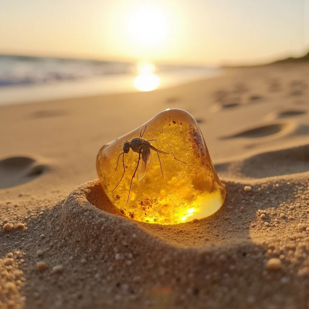 cinematic macro shot, at the beach, pale yellow sand at the beach, wind picks up sand blowing across the desert in the foreground is a piece of amber, a small mosquito trapped in the middle of amber, the sun is low in the sky it shines through the amber, the amber is steaming slightly, 4k, highly detailed