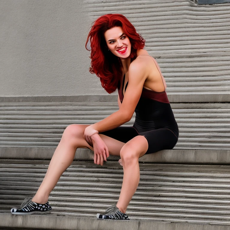 1 young beautiful bodybuilder woman wearing symbiote with a wide jaw, full body visible, soft smile, smooth face, happy face expression, red hair, green eyes, sitting on a building ,