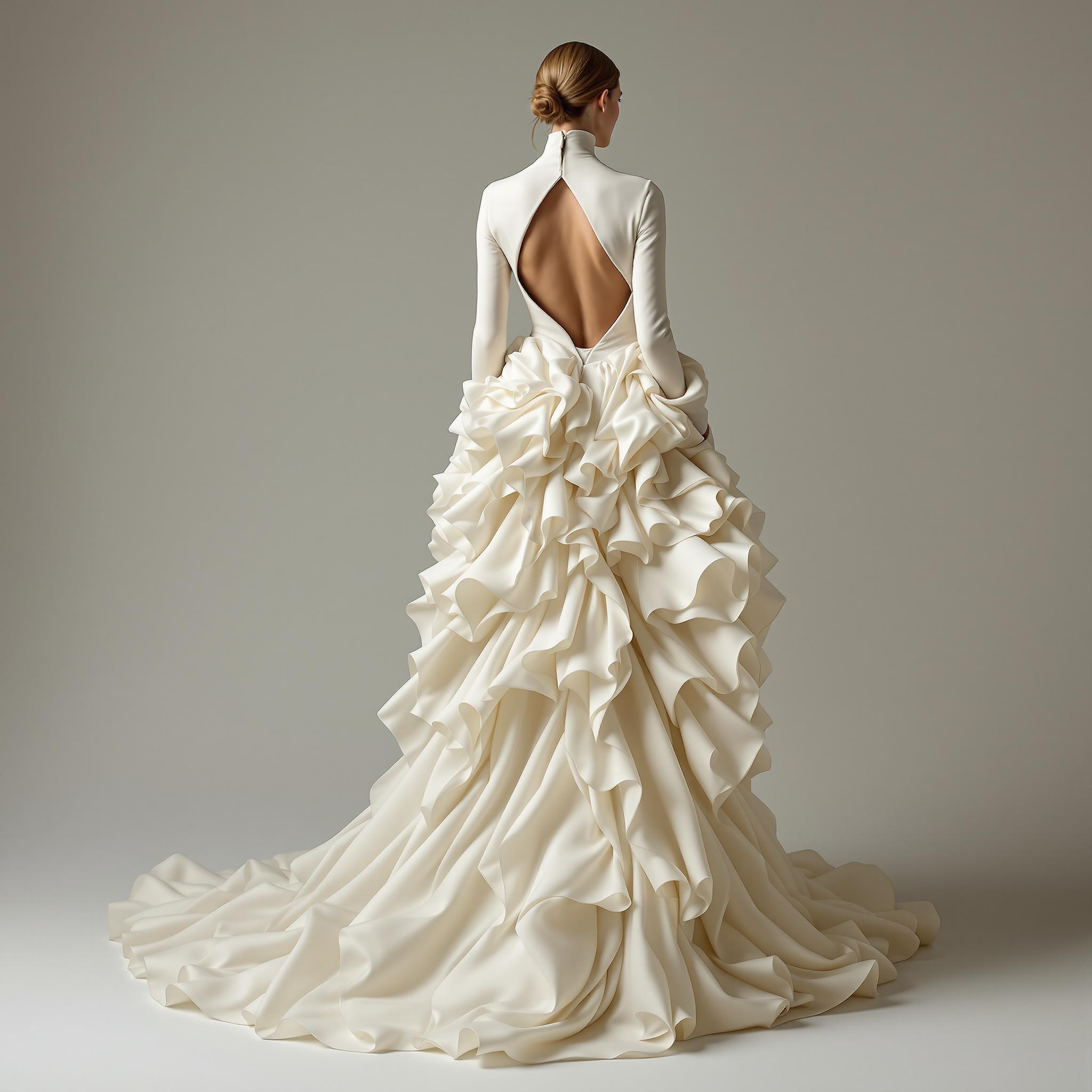 The image is a full-length portrait of a woman in a flowing cream dress. The dress features a high neck and long sleeves, with a large cutout on the back, and the fabric cascades down into a dramatic, floor-length train. The garment is crafted with waves and layers of fabric, creating a sense of movement and depth.