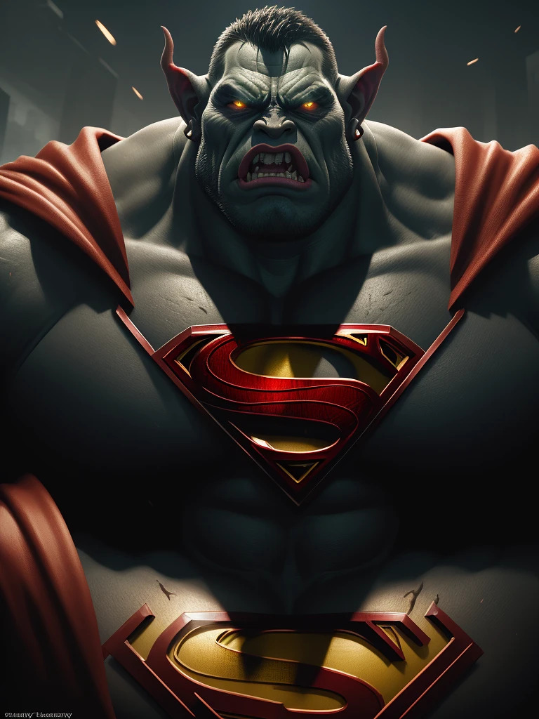 body portrait, very angry superman orc, intimidating, menacing, powerful, low angle, horror, octane render, smooth, sharp focus, dramatic light, fine details, masterpiece, trending on artstation, 4 k, art by stanley lau and jason chan and mark hill