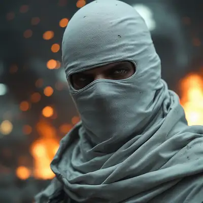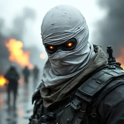 aidmaMJ6. 1, gundam counter terrorist from the videogame counter strike, face covered with white sheet and holes for the eyes, realistic, warzone background with explosions in the back, cinematic shot,