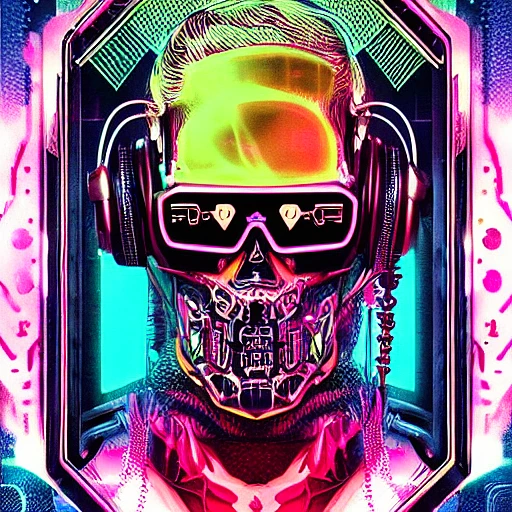 nft style, cyberpunk, synthwave, tarot card with intricate detailed frame around the outside | with cyberglasses neon, and earphone, dj sound, futuristic, gold, diamond, side profile of cyberpunk body with cyborg skull | cyberpunk | styled in Art Nouveau | insanely detailed | embellishments | high definition | concept art | digital art | vibrant, hyperdetailed, intricate, kaleidoscope, extremely beautiful, ranking ligth, cinematic lighting, photo realistic, white background max detail, ranking ligth, cinematic lighting, photo realistic, by mandy jurgens, moebus, jon foster, alphonse mucha, glazing, pablo picasso, pinot noir, chiaroscuro, leonardo da vinci, Michelangelo, 8k