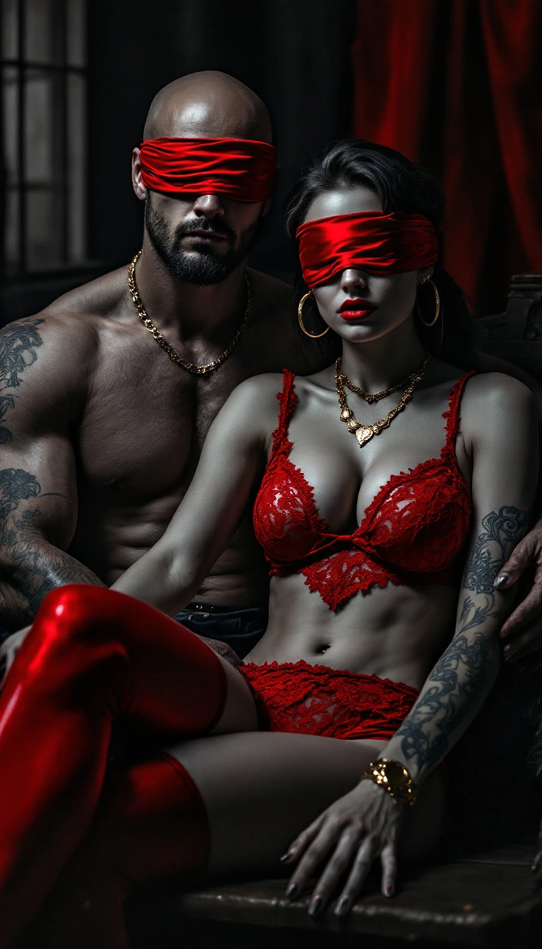 The image is a hyperrealistic black and white photography of a man and a woman sitting on a wooden bench. The woman is wearing a red lace bikini and red thigh-high latex boots, with a red satin blindfold covering her eyes. She is also wearing a gold necklace and golden hoop earrings. The man is bald and has a tattoo on his arm. They are both looking at the camera with serious expressions on their faces. The background is a dark room with a window and a red curtain. The overall mood of the image is intense and provocative.