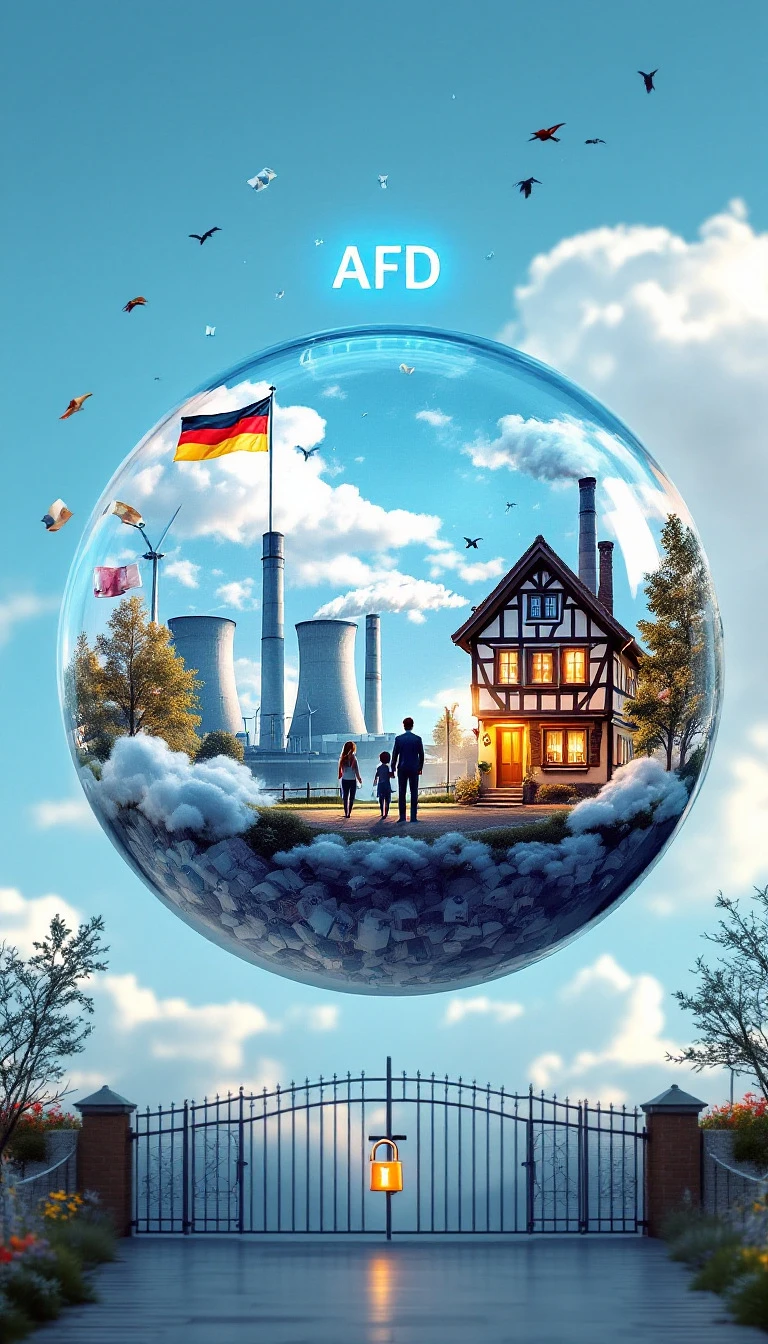 A pristine glass sphere floating in front of a serene blue sky with gentle white clouds, inside the sphere is a symbolic composition: A traditional German half-timbered house stands proudly on one side, while industrial smokestacks emit plumes on the other side, representing the tension between tradition and industry. A German flag waves subtly in the background, while Euro banknotes flutter downward, symbolizing economic policy. The foreground shows a closed gate with a padlock, representing strict immigration policy. Nuclear power plant cooling towers and coal plants are visible in the middle ground, contrasting with fading wind turbines in the distance. A family silhouette stands in the center, representing traditional values. The word 'AFD' appears as a blue holographic projection floating above the sphere, casting a subtle glow. Photorealistic style, volumetric lighting, ultra-detailed, 8k resolution, soft ambient occlusion, hyper-detailed glass refraction, atmospheric depth --ar 16:9 --s 750 --style raw