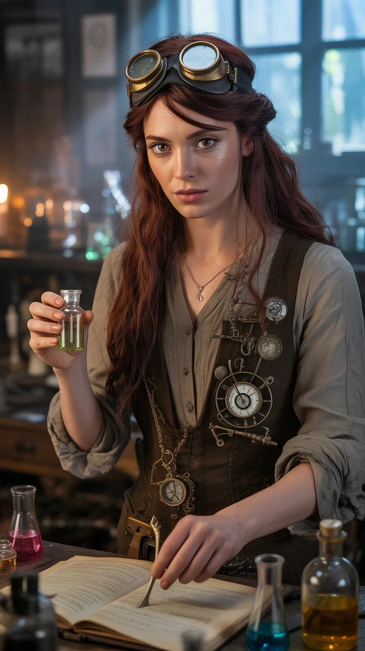 The Time-Traveling Alchemist: A brilliant and resourceful scholar with long, dark auburn hair, often styled in a practical manner, adorned with goggles, clockwork devices, and alchemical vials, and her presence exudes knowledge and intelligence, and her movements are both deliberate and precise. Her eyes are piercing, amber, and seem to see into both the past, present, and future. She wears layered clothing with multiple pockets, in shades of brown, grey, and tan, often stained with different chemicals and alchemical compounds, and her clothes have elements from different eras. She works within a time-displaced laboratory, surrounded by strange devices, and bubbling potions from different time periods, where the lighting is a blend of candlelight and the glow of temporal artifacts, and her presence seems to bend the rules of time itself. Her expression is focused and determined, with a deep connection to both science and the flow of time. She creates powerful potions and manipulates temporal anomalies using alchemical knowledge and time traveling devices. Her design has a unique blend of steampunk, alchemical, and temporal elements.