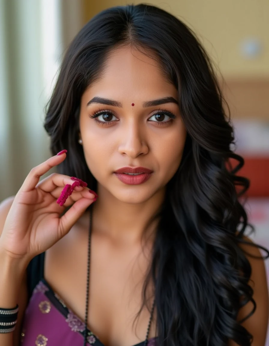 Anushka Shetty, 24-30 years old, Indian hair style, trying to love, inhaled chest, wide open eyes, A plus curvy shaped body structure, showing bangles on hand, bindi, high-quality photo portrait, shot on a Kodak camera, photography, environmental, double eyelid --ar 34:65 --style raw, indian ascent, flying kiss, feeling happy, beautiful legs, wearing violet transparent sari with black silk blouse, includes full body structure, bedroom, Mwah, A plus huge swollen boobs.