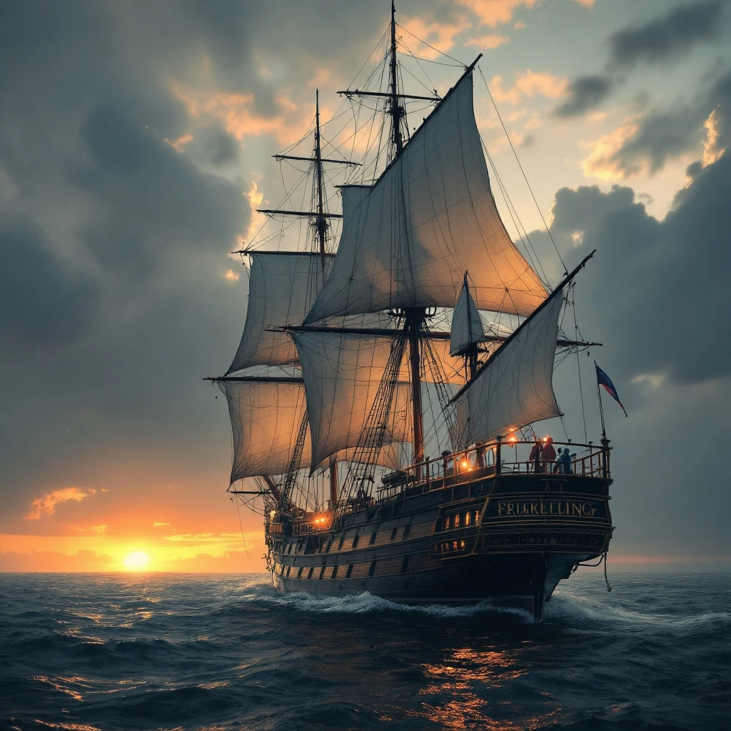 Photo of a ultra realistic sailing ship, dramatic light, pale sunrise, cinematic lighting, battered, low angle, trending on artstation, 4k, hyper realistic, focused, extreme details, unreal engine 5, cinematic, masterpiece, art by studio ghibli, intricate artwork by john william turner