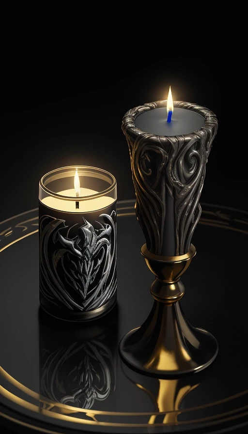 Candle on the table with the design and character of Venom The Candle is gold and Black dark, no watermark, no copyright, high gloss, highly detailed, intricate, silver scrollwork, unreal engine 5, octane render, lumen reflections, quixel megascan, 8k, studio lighting, —ar 1080:1920