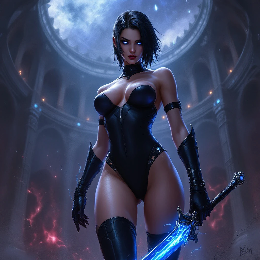 digital painting in the style of warhammer 40k of a female comissar, standing infront a gothic circh, holding a sabre with blue lightning, cybereyes, black ultra tight onepiece bathsuit, black sidecut hair, very big tits