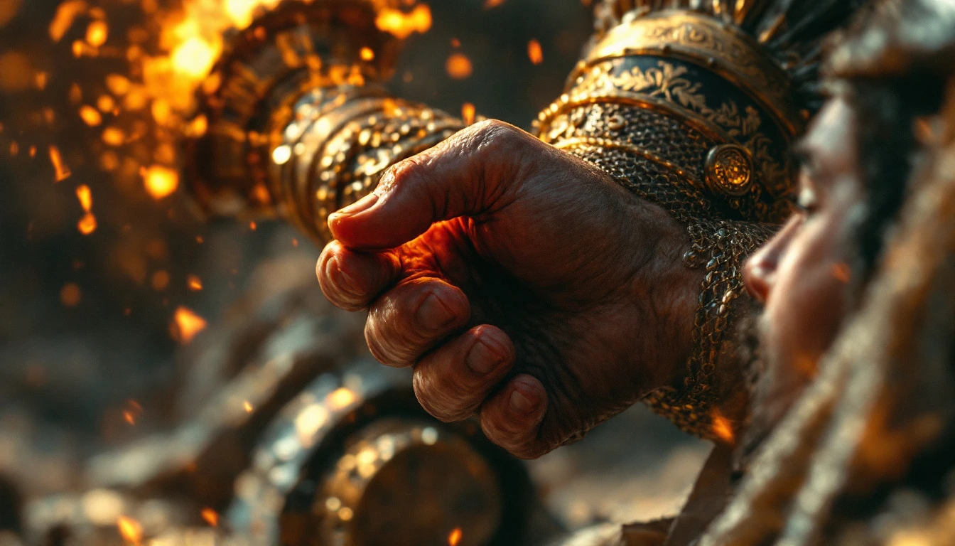 Ultra-realistic . Close-up of Yutab’s hand passing the torch to a young warrior. [Yutab: strong Achaemenid Persian hand, passing to a youthful Persian figure wearing an engraved Achaemenid helmet with chainmail veil