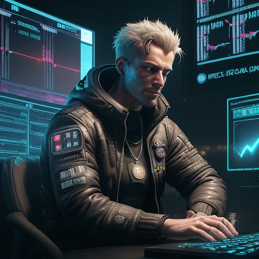 The Trading room is digital art dim, with only the white light from the screens illuminating the room. The Trader is sitting in front of a wall of large screens, typing code on a keyboard. He wears cyberpunk crypto coin implants and drinks Bitcoin coffee. He loves coffee. The programmer is surrounded by chaos, hyper realism, high detail, octane render, celestial arena,  fire storm,  ice storm,  body crackling with lightning,  lightning halo,  tilted halo,  crackling lightning,  lightning charged atmosphere,  beautifully detailed fur,  brilliant detailed eyes,  beautifully detailed face, but he doesn't seem to notice or care. Digital Art. 3D Render 8k