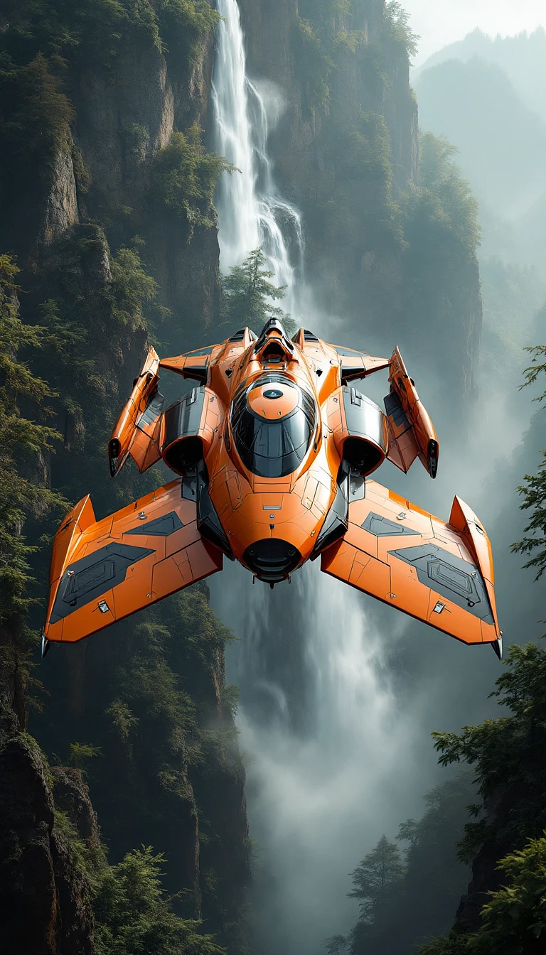 Futuristic Concept Space Craft with Military Jet features and metallic orange with matte black and white details, luxury, ((waterfall landscape) , (forest background) , (hovering) , highly detailed, 8k sharp focus, full wide photo shot, ultra photorealistic, Sci-Fi influenced
