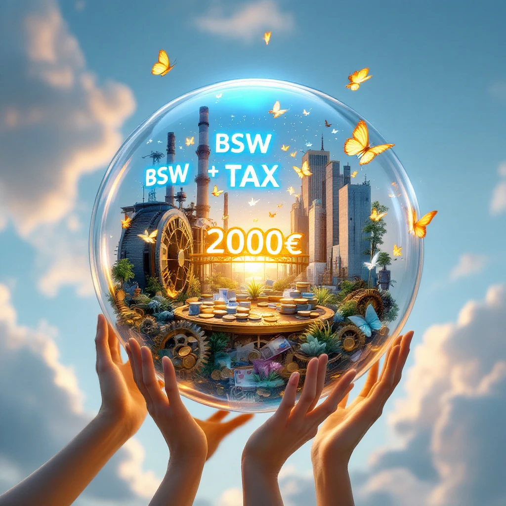 A photorealistic glass sphere floating in a serene blue sky with soft, wispy clouds, containing a symbolic representation of economic transformation. Inside the sphere, a holographic display shows 'BSW' and 'TAX' in glowing blue letters. The sphere contains a surreal scene where euro coins and banknotes are morphing into butterflies, symbolizing financial freedom. A golden bridge spans from dark industrial structures to bright, modern buildings, representing economic transition. A mechanical clock gear system intertwined with growing plants suggests the blend of industry and sustainability. Multiple hands reaching up towards a shining '2000€' symbol floating above, representing the tax-free allowance. The entire scene is illuminated by a warm, golden light from above, creating subtle reflections and refractions in the glass sphere. The image should have a depth of field effect with the sphere in sharp focus and the background slightly blurred. Hyperrealistic rendering, cinematic lighting, 8k resolution.