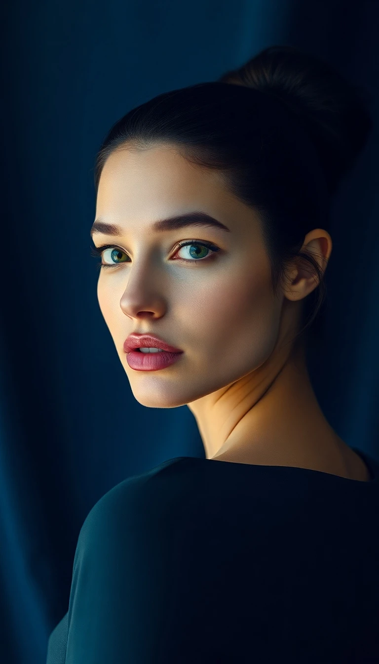"A cinematic style fine art photograph, with gentle, soft light and soft pastel colours, features a close-up head and shoulders portrait of a supermodel in her early 20s. head tilted slightly left, Her luminous complexion is sculpted by Rembrandt lighting. She has raven black hair in a bun, vivid green-silver eyes turned to her right looking into camera, full parted pink lips. A navy blue silk backdrop offers harmony, with a muted golden rim light adding depth. The diffused shadows, subtle illumination, and soft contrast create a serene, confident mood. Photographed with a Sony A1 and 120mm lens for high resolution and an editorial style. "