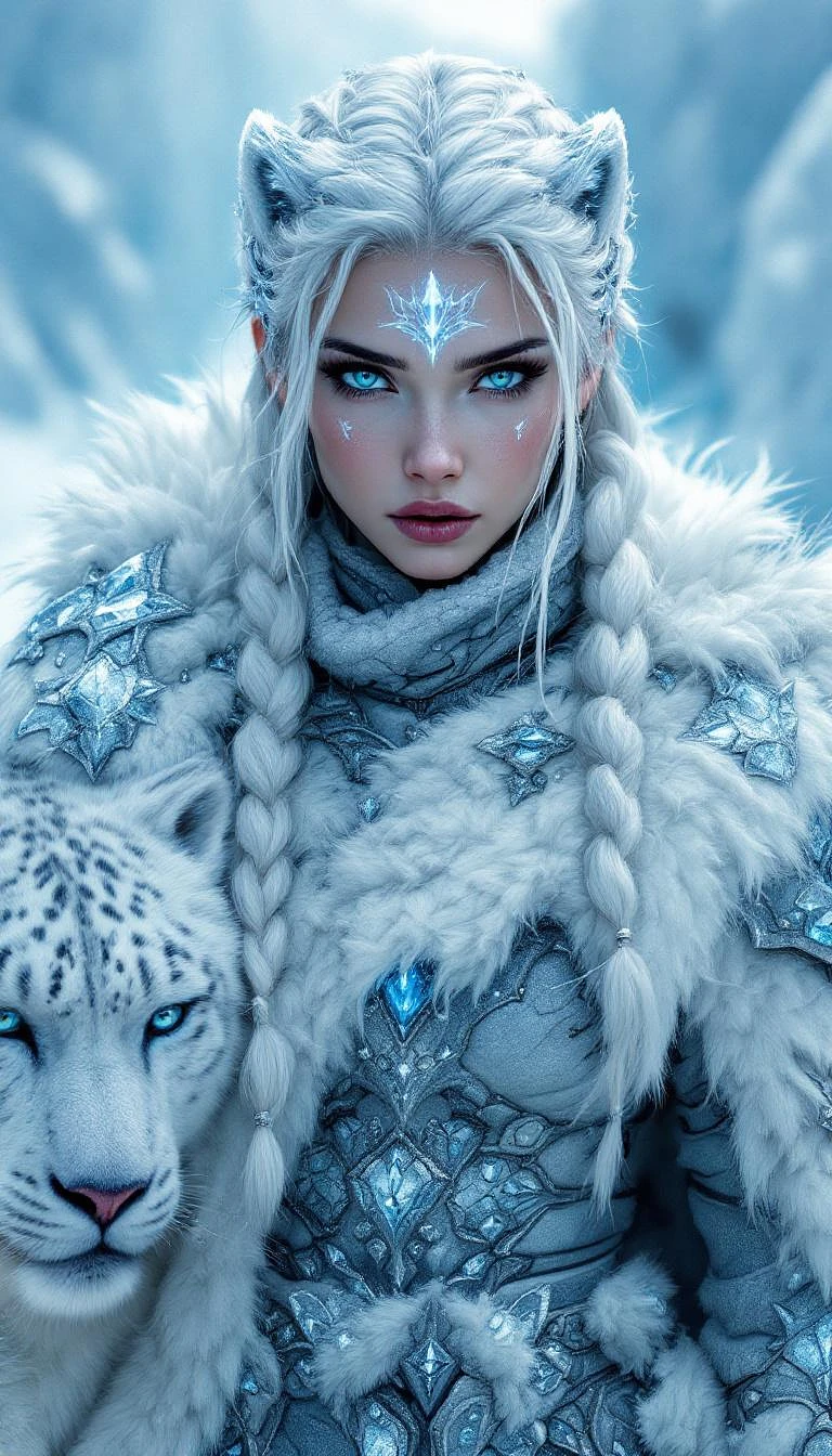 Incredibly beautiful Norwegian girl with blue eyes, beautiful blue eyes, with perfect irises, long eyelashes, black eyeliner, freckles. A cinematic digital artwork featuring a resilient, female frost warrior in a resolute yet weary, she is escorted by a huge white snow leopard, they walk towards the camera in full height, she has beautiful legs, on which she has put on armored boots in blue crystals, set against a desolate, ice-covered, arctic backdrop with a cold, glacial blue glow, The subject, a humanoid character with long, braided white hair and piercing, icy blue eyes, embodies a fusion of elemental power and warrior spirit. The intricate, silver and ice-blue armor, with a crystalline, frost-like texture, covers the entire body except for the face, which is partially visible, wind-chapped and marked by faint, glowing blue frost patterns on the forehead and cheekbones. A tattered, white fur cloak with a prominent, stylized frost rune on the shoulder adds to the harsh, arctic atmosphere. In their right hand, they grip a cracked, frost-covered greats word, pointing downward, surrounded by a swirling mist of ice crystals, casting sharp, icy shadows on the frozen surroundings. The background is a vast expanse of cracked ice, jagged ice formations, and snow-covered mountains, with hints of blizzards and strong winds, amplifying the sense of isolation and elemental power. The lighting is focused on the character, emphasizing the textures of the armor, creating a sense of depth and chilling realism, a playfully shy look. Perfect white teeth.