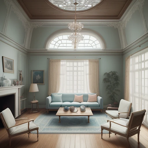 High resolution photography interior design, dreamy sunken living room conversation pit, wooden floor, small windows opening onto the garden, bauhaus furniture and decoration, high ceiling, beige blue salmon pastel palette, interior design magazine, cozy atmosphere; 8k, intricate detail, photorealistic, realistic light, wide angle, kinkfolk photography, A+D architecture