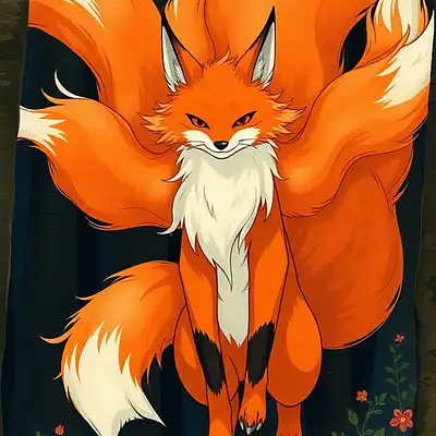 UPA cartoon style japanese fox spirit yokai with nine tails in a dark forest. 1950s limited animation, flat graphic style, stylized designs, energetic
