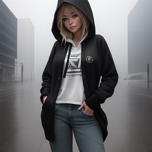 photography, in the city, woman, natural pose, Sony α9 II, Sony FE 100-400mm f/4. 5-5. 6 GM OSS lens, loose black long cardigan with logo patch and black hoodie, denim pants, natural ights, rainny day with fog --no an odd shape, mannequin, crop, excessive design, an awkward pose, strange details, typo, unfinished forms, necessary objects, logo, three hands, three legs, weired eye, celebrity face, strange hand shape --ar 9:16 --style raw --stylize 700 --v 6
