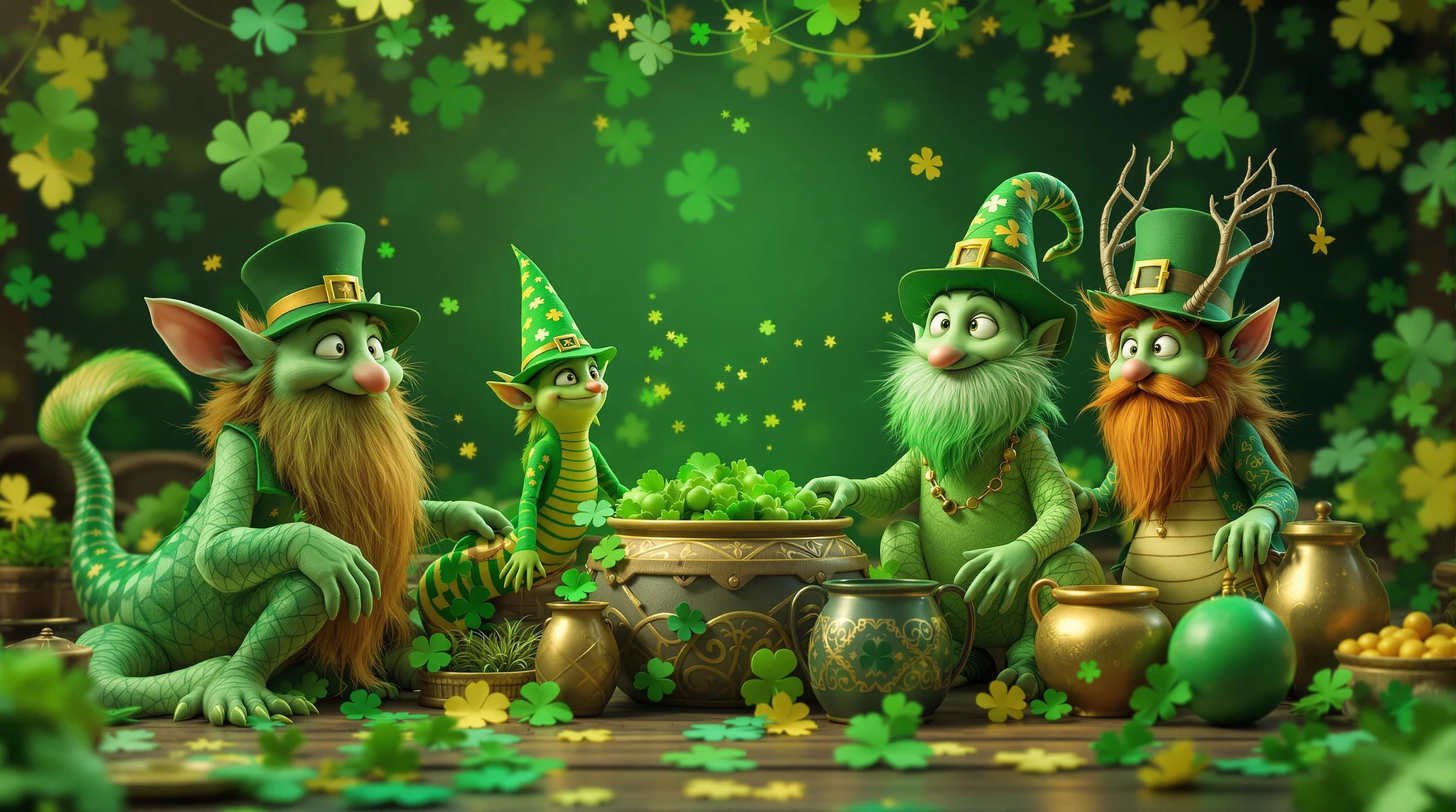 St. Patrick's Day celebration featuring mythical fantasy creatures of Ireland, such as leprechauns, merrows, and púca, amidst festive shamrocks and Celtic patterns. 3d photo realism uhd
