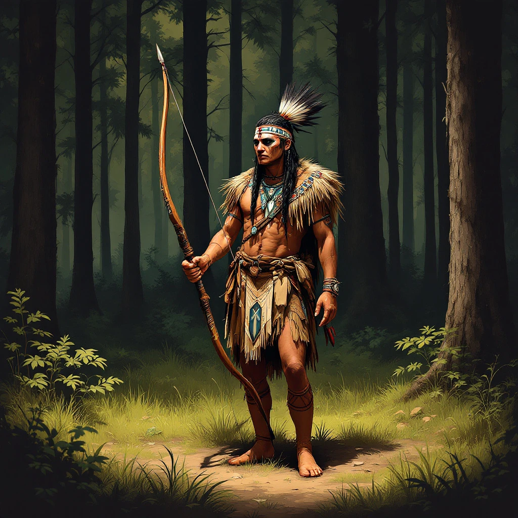 Centered image of a Choctaw Indian painted according to his traditional culture with a bow and arrow and traditional elements of his culture, in a clearing in the forest 400 pixels stylized figurative art style