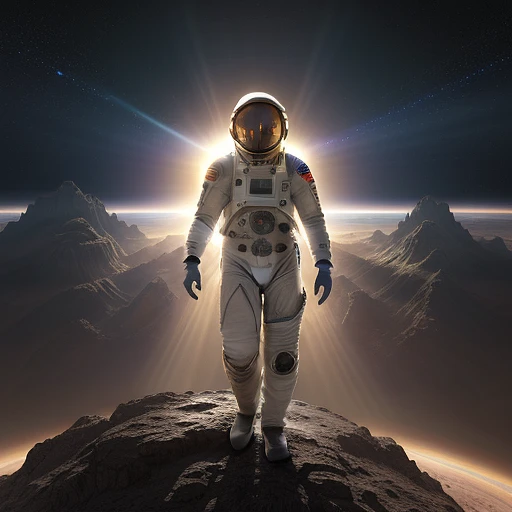 An astronaut landing on a new planet with a civilization, masterpiece, intricate, elegant futuristic wardrobe, highly detailed, digital painting, artstation, concept art, crepuscular rays, smooth, sharp focus, illustration, background is made of stars and vibrant space nebula, art by artgerm and greg rutkowski and alphonse mucha, ultra details, soft light, HD, 8K