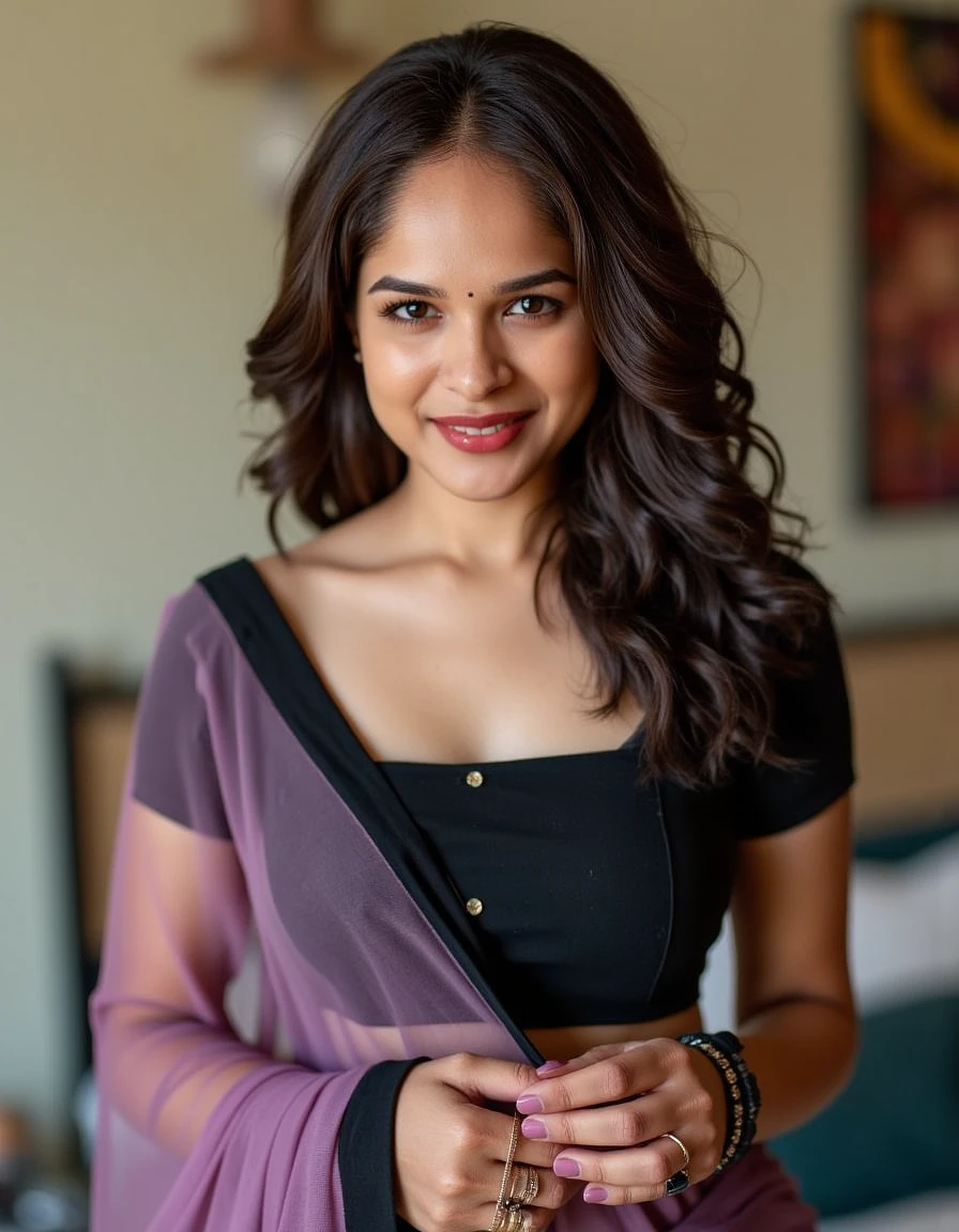Hayley Atwell , 24-30 years old, Indian hair style, trying to love, inhaled chest, wide open eyes, A plus curvy shaped body structure, showing bangles on hand, bindi, high-quality photo portrait, shot on a Polaroid camera, photography, environmental, double eyelid --ar 34:65 --style raw, indian ascent, flying kiss, feeling happy, beautiful legs, wearing violet transparent sari with black silk blouse, includes full body structure, bedroom, standing, Mwah, A plus huge swollen boobs, Kamasutra slut.