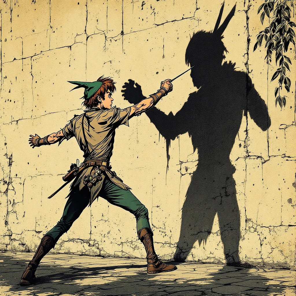 Photorealistic comic book cover illustration, full body shot of peter pan fencing with his shadow against a wall, hand drawn, in the form of an old drawing, extremely detailed, in the style of Moebius, Metal Hurlant, Heavy Metal comic, full color, grain effects, film effects --no helmet --chaos 35 --ar 4:5 --stylize 400 --v 6. 1
