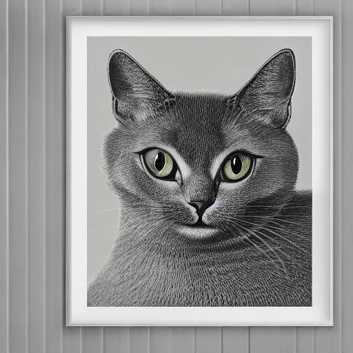 Draw a grey cat, hyper realistic eye level exterior photo of a mid century modern style cat overlooking the ocean, daylight, indirect lighting, AD magazine, Frank Lloyd, Eames, Mies van der Rohe