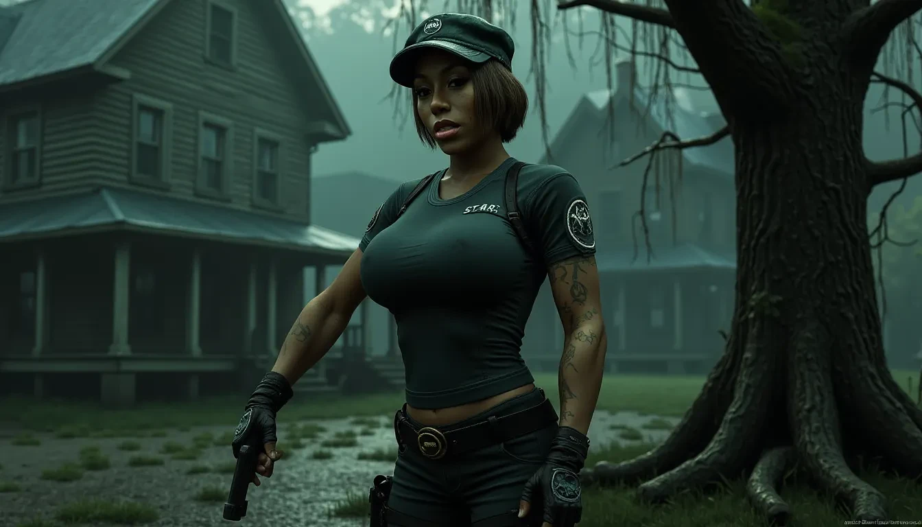 Create a vibrant hyperrealistic 3D render RPG scene inspired by Resident Evil. Jill Valentine in tactical gear stands alertly with a pistol in hand in a dark, atmospheric outdoor setting featuring a dilapidated house and gnarled trees.