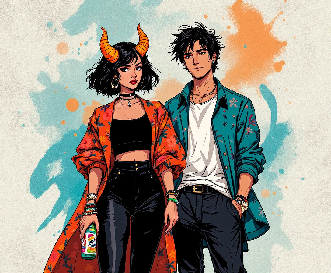 Image is a digital illustration featuring two stylized characters with a vibrant and artistic design. The layout is vertical, showcasing a male and female character standing side by side. The female character has short, wavy dark hair with orange horns, wearing a black top, high-waisted dark pants, and a long, floral-patterned coat. She holds a bottle with a colorful label. The male character has tousled dark hair, wearing a teal and orange patterned coat over a white shirt and dark pants. Both characters have medium skin tones and are adorned with various accessories, including bracelets and earrings. The background is a textured, abstract mix of blue and orange splashes. The overall style is dynamic and expressive, with a focus on bold colors and intricate details.