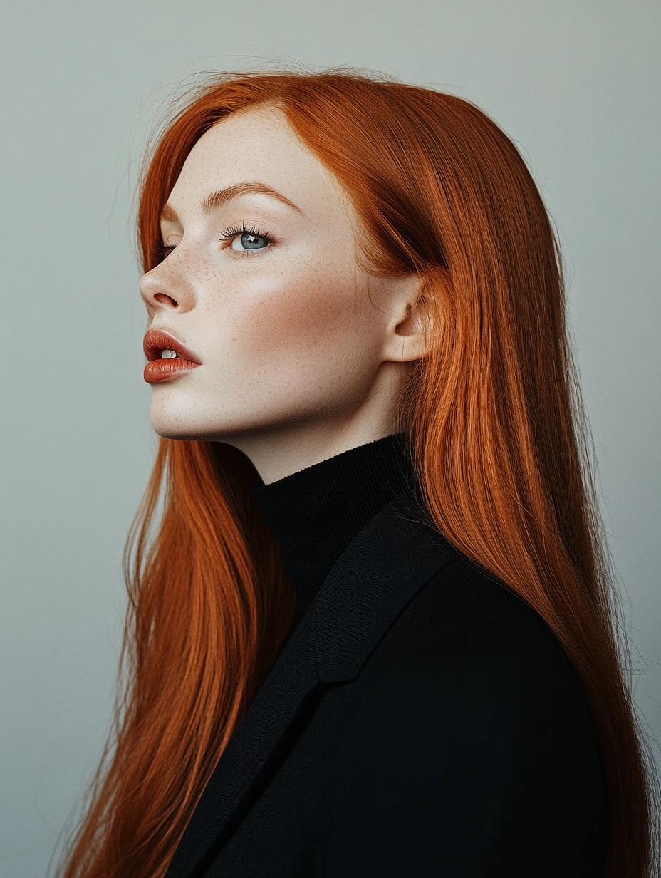 A high-fashion editorial portrait of a woman with long red hair, in the style of modern fashion photography, sleek and minimalist