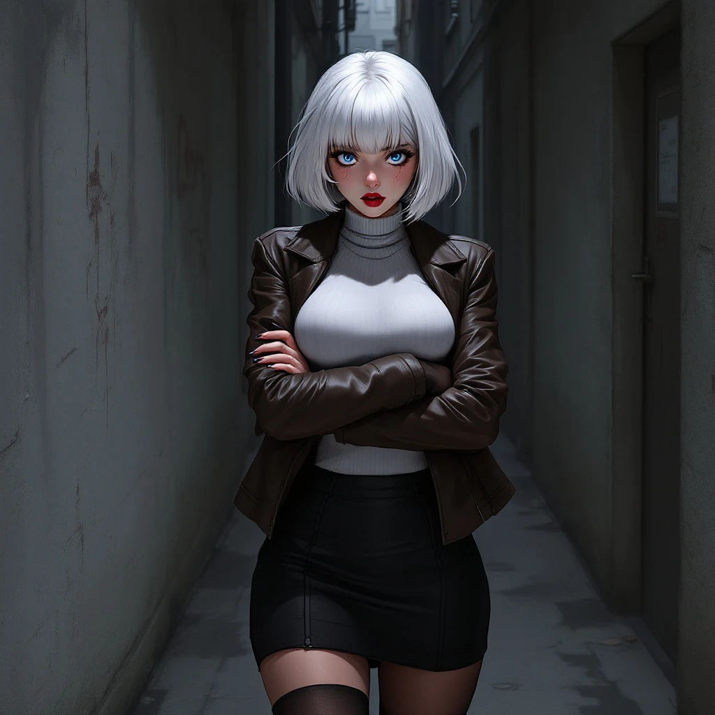anime, woman, white hair, bob cut, blue eyes, freckles, red lips, white turtle neck sweater, tight turtle neck sweater, short leather jacket, brown leather short jacket, black tight skirt, short skirt, black high heels, scared expression, big chest, stockings, arms crossed, eyes off camera, walking in a dark alleyway