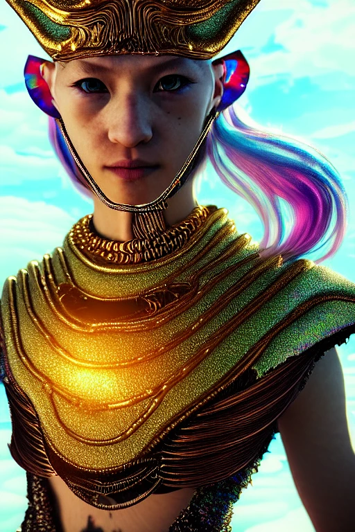 hyperdetailed closeup portrait of a stunningly beautiful caucasian androgynous guard wool made of iridescent metals brown gems, bright rainbow nimbus, golden necklace, inspired by ross tran and wlop and masamune shirow and kuvshinov, concept art, intricate, photorealistic, octane render, rtx, hdr, unreal engine, dnd digital art by artgerm