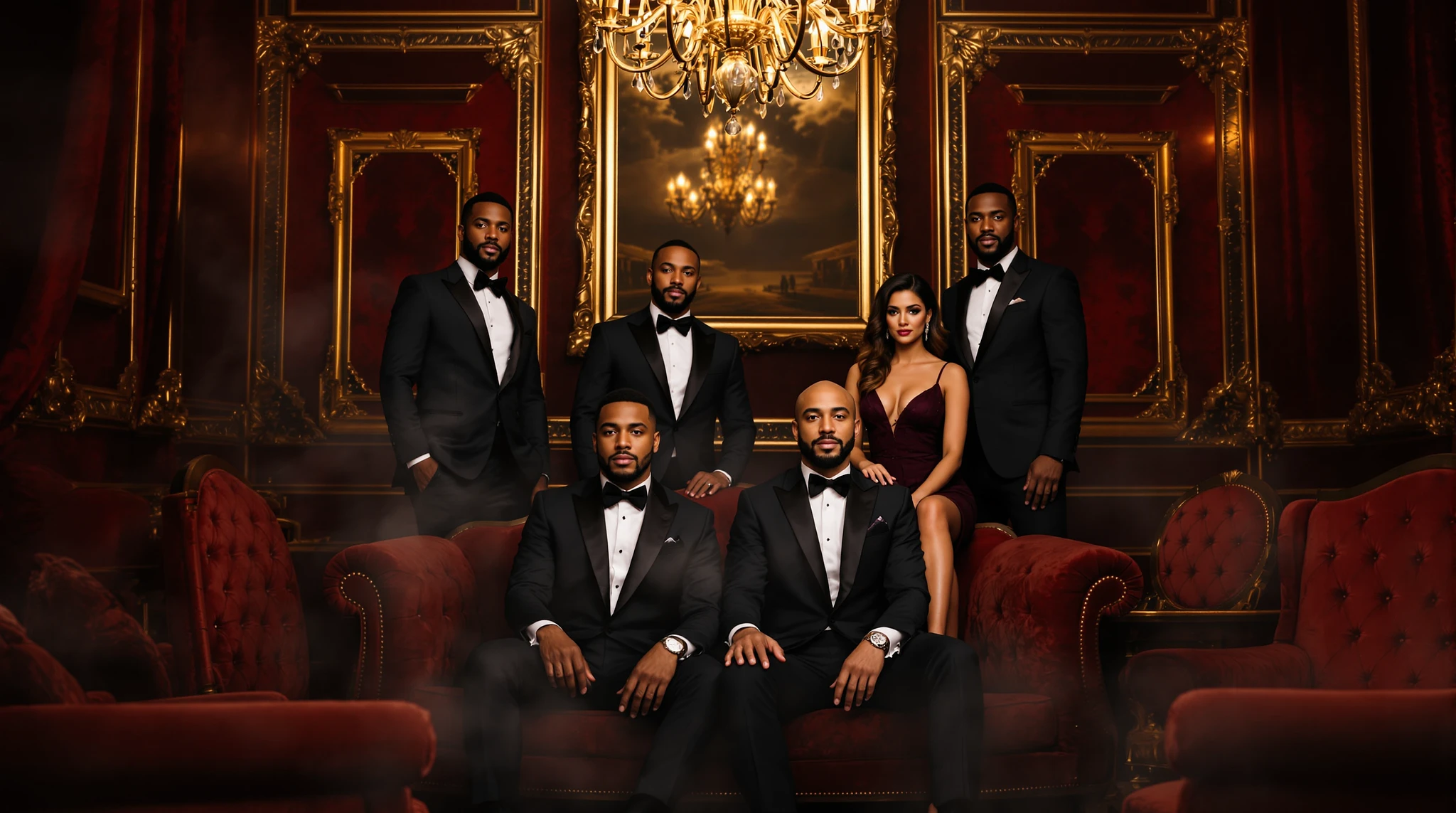 4 men and women in formal wear, luxury setting, Diverse group of adults, 25-45 years old, various ethnicities. All men are dressed in formal dark suits and black bow ties. Women are in stylish, dark-colored evening gowns. A luxurious, opulent interior. Rich, dark red velvet armchairs and sofas. Decorative, ornate golden frames on the wall. Golden chandelier hangs from the ceiling, illuminating the space with soft light. Smoke effect Perspective shows a room with multiple individuals seated and standing. Sharp, vivid tones of gold, dark red and brown. Detailed ornamentation of the room and the luxurious fabrics are noticeable. Composition balanced, centrally focused on the group. Photographic realism, theatrical lighting and setting. Classic style, elegant atmosphere. Mood is sophisticated, rich, and celebratory.