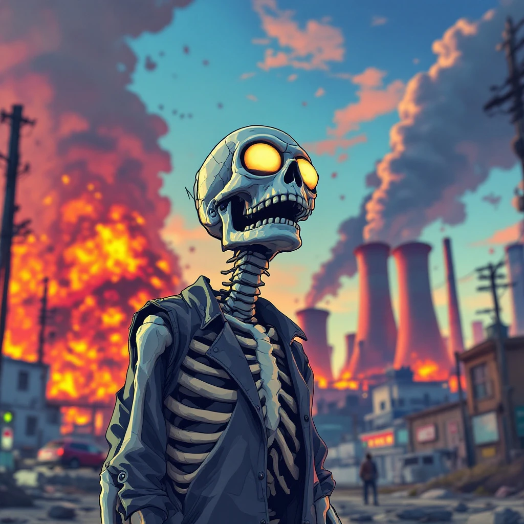 homer jay simpson as a skeleton in GTA illustration, surprised look, site of the explosion of a radioactive power plant, vibrant colors, dynamic composition --ar 2:3 --v 7