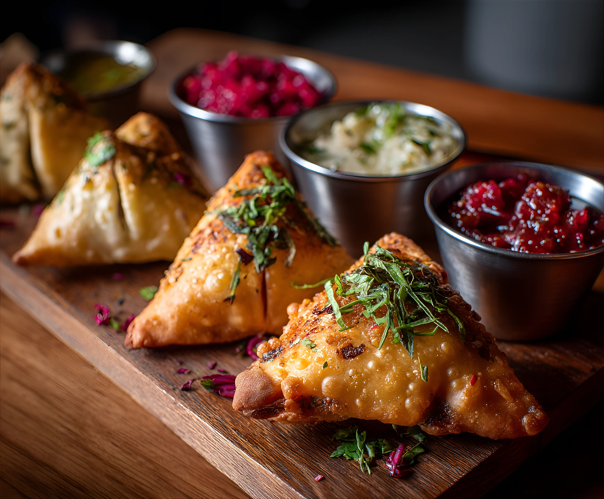 Several golden-brown, triangular samosas are arranged on a wooden platter. The samosas are topped with fresh herbs, and their pastry is crisp and flaky. Small metal bowls containing vibrant, red and pink salsa or chutney are visible in the background, adding color to the image. The wooden platter provides a warm, natural backdrop to the samosas. The lighting is focused on the samosas, highlighting their textures and colors. The composition showcases the samosas in the foreground, with the bowls of chutney slightly out of focus in the middle ground. The perspective is slightly above the food, capturing details of the pastry. The atmosphere is warm and inviting, suggesting a restaurant or food presentation. The focus is entirely on the samosas, which are the central subject of the image.