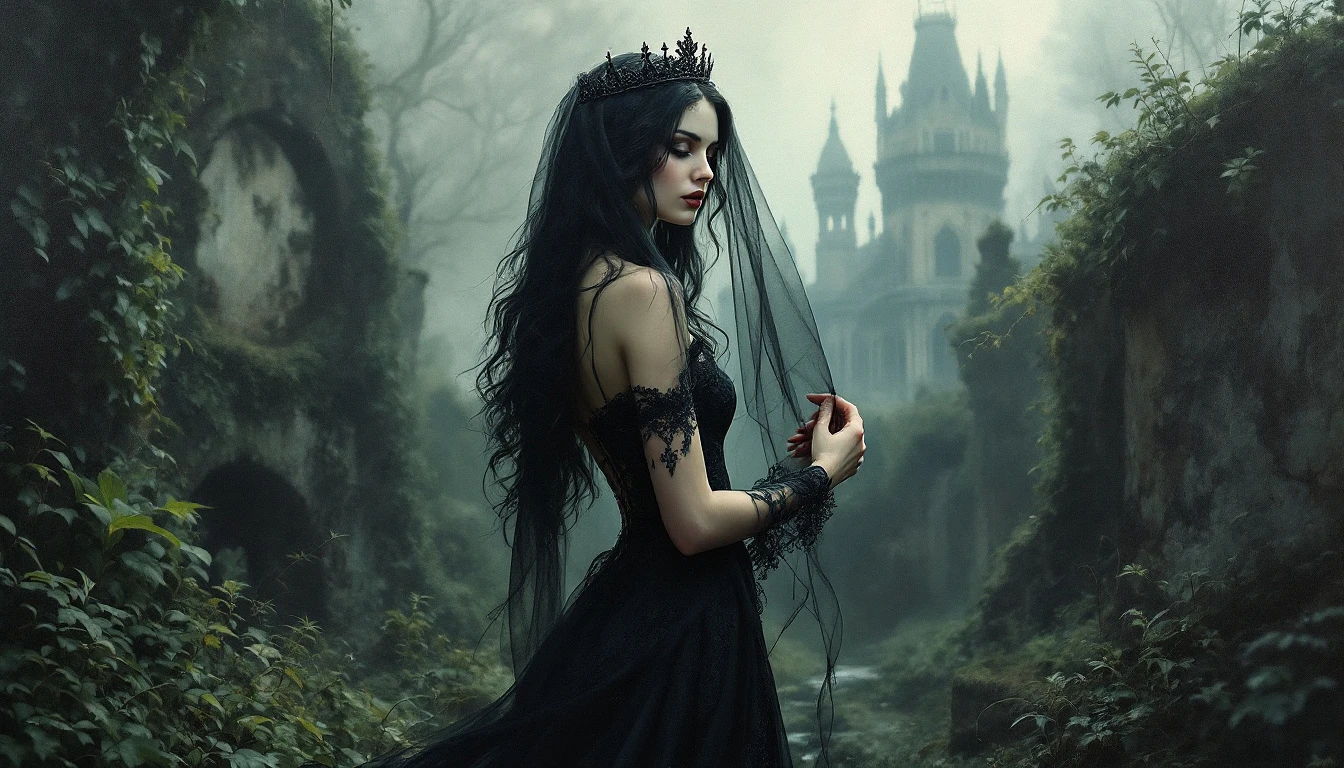 ultra-detailed oil painting:1. 3, impasto:1. 2, high relief texture:1. 2, hyper realistic style:1. 3, female:1. 5 with delicate pale skin, graceful posture, back partially turned, head slightly bowed, long black wavy hair:1. 3, wearing a flowing dark gown with subtle gothic lace, a sheer black veil covering her head, held by an elegant black crown, standing in a decaying overgrown garden, ancient ivy-covered stone ruins, soft mist, cinematic composition, fine soft shadows over her profile, muted softly textured artistic background, rich painterly brush strokes, melancholic and mysterious mood, gothic romanticism, inspired by Edgar Allan Poe’s The Fall of the House of Usher, full view of the mansion in the background, mansion architecture highly detailed and crisp, panoramic scene capturing both character and environment, masterpiece, 8K ultra HD, aspect ratio 16:9.
