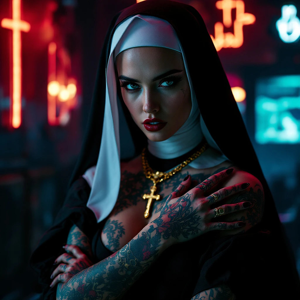Full body shot of a young beautiful tattooed nun with a modern twist. She wears traditional nun attire with a white veil, her hands adorned with intricate tattoos. Her expression is defiant. Action dramatic pose. She wears a large gold cross necklace, adding a bold religious symbol to the image. Background of night club interior with neon light. The lighting is moody and dramatic, with detailed shading --no text, letters, logo --ar 4:5 --personalize 42unl2w uxyq8ow 41t5sg3 gupt5yl --stylize 1000 --niji 6