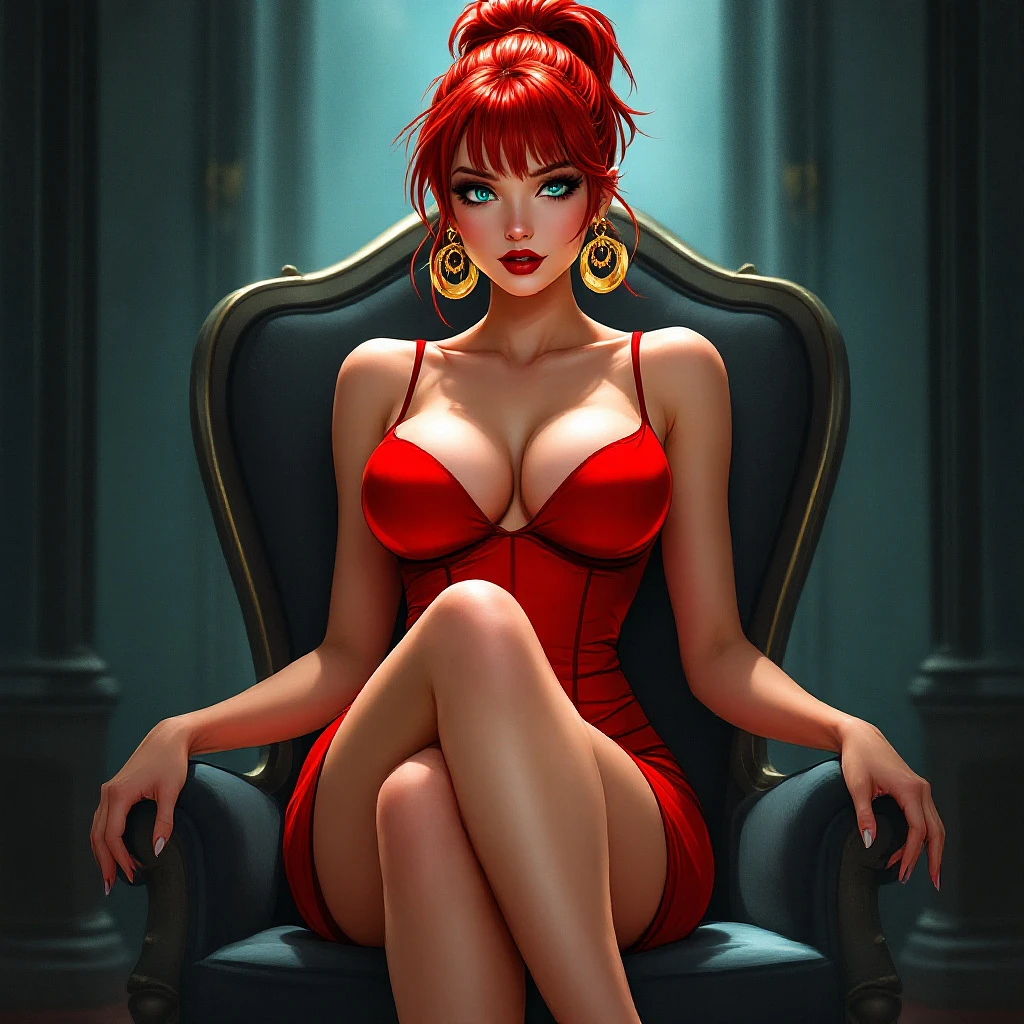 anime, woman, red hair, short ponytail, cyan eyes, red lips, red bodycon dress, tight dress, red high heels, round golden earrings, bare legs, closed cleavage, massive chest, bare arms, with straps, sitting on a chair, legs crossed