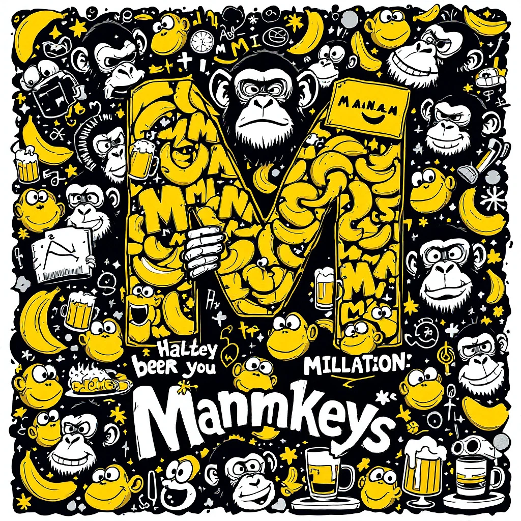 An intricate and mainly black and white, and yellow and dark green, (two contrasting, extra colors for details) , graffiti-style poster featuring various elements, such as cartoon characters, symbols of urban culture, and dynamic expressions, focusing on minimalistic chimp faces, the letter 'M', bananas, beer, is part of the image. the word 'Mannkeys' is hidden --ar 63:128 --stylize 750