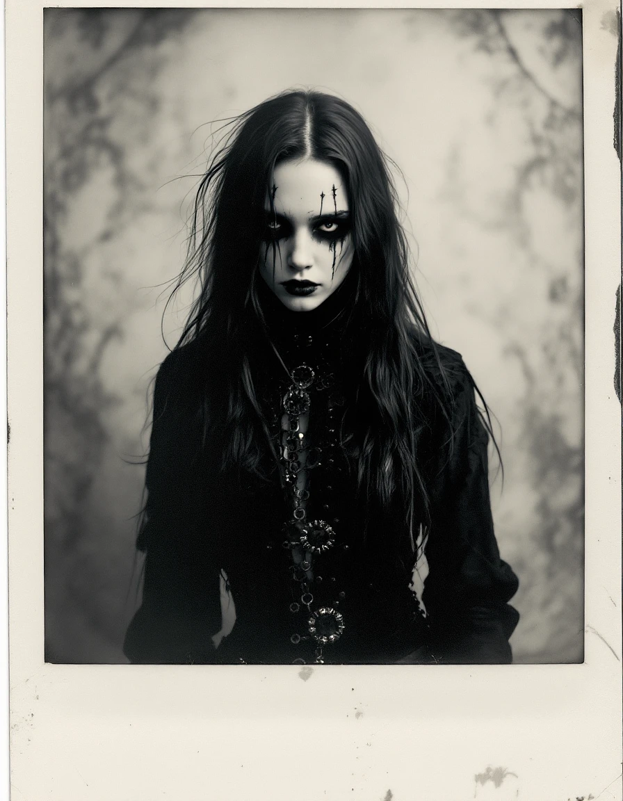 Black metal girl, old polaroid photo, medieval, sad mood, b&w