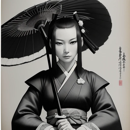 3/4 portrait très jolie femme japonaise glamour visage très détaillé , , en en armure guerrière type samouraï tenant katana en main , regard noir profond espiègle , arrière parc japonais flou en estampe , écriture japonais aïkido, couleur rouge blanc en désaturation .